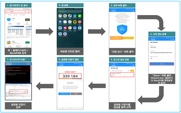 응급 일회용 인증키는 일회용 인증키 생성기인 BaroPAM 앱을 사용할 수 없을 때 분실한 경우를 대비하여 SSH 서버에 다시 액세스하는데 사용할 수 있는 접속이 가능한 Super 인증키 이므로 어딘가에 적어 두는 것이 좋다.