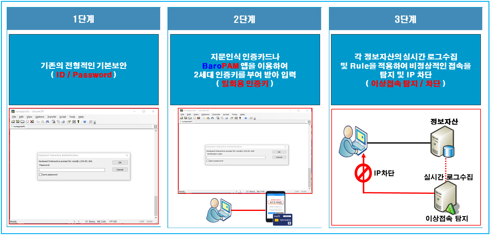 Mac/Linux/Unix 환경에 대한 BaroPAM 솔루션의 보안 전략은 3단계로 구성되며, 1단계는 전형적인 기본 보안(ID/Password), 2단계는 일회용 인증키를 적용한 보안, 3단계는 이상접속 탐지 및 차단을 통한 불법적인 정보자산의 접속 제어로 구성되어 있다.