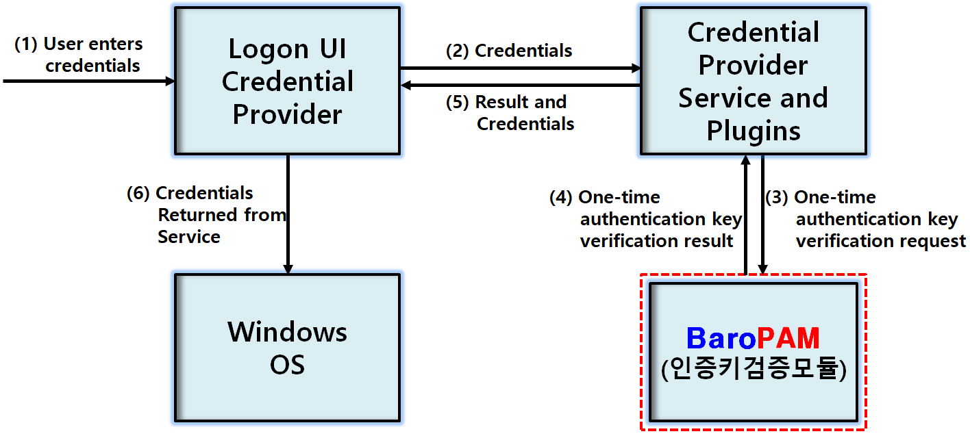 Windows 환경에 대한 BaroPAM 솔루션의 보안 전략은 3단계로 구성되며, 1단계는 Windows 부팅 시 CMOS 보안(Password), 2단계는 전형적인 기본 보안(ID/Password), 3단계는 일회용 인증 키를 적용한 보안 전략으로 구성되어 있다.