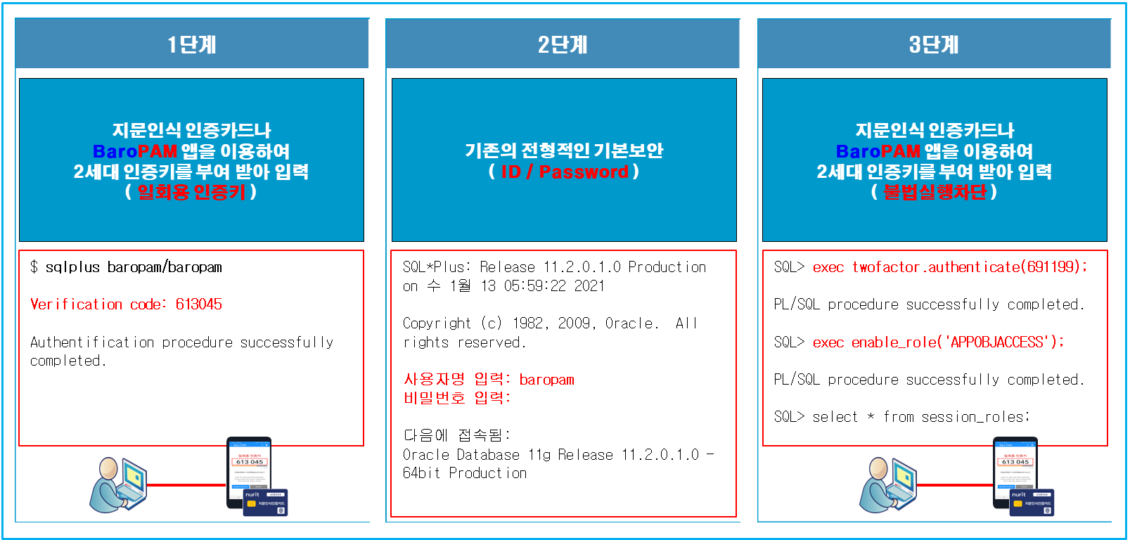 데이터베이스 환경에 대한 BaroPAM 솔루션의 보안 전략은 3단계로 구성되며, 1단계는 전형적인 기본 보안(ID/Password), 2단계는 일회용 인증키를 적용한 보안, 3단계는 데이터베이스 접속 시 일회용 인증키를 적용한 보안으로 구성되어 있다.