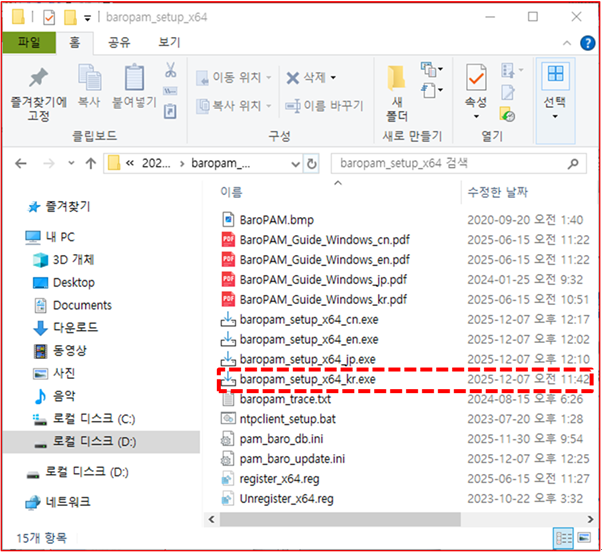 첫번째, 압축된 BaroPAM 설치 파일(baropam_setup_x64.zip)의 압축을 풀면 다음과 같은 "baropam_setup_x64" 디렉토리가 생성되며, 다음과 같은 파일이 존재한다.