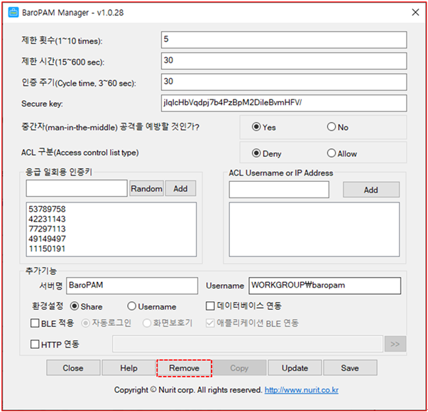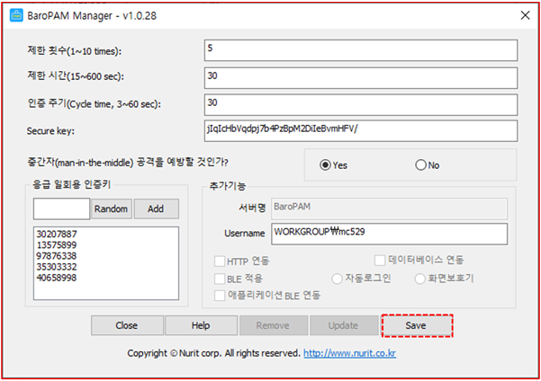 만약, BLE(Bluetooth Low Energy)를 사용하는 경우에는 설정한 서버명과 일회용 인증키 생성기인 BaroPAM 앱에 등록된 서버명이 서로 다른 경우 Windows의 자동 로그온과 화면 보호기의 잠금방지/자동잠금/자동해제하는 기능이 정상적으로 작동되지 않는다.