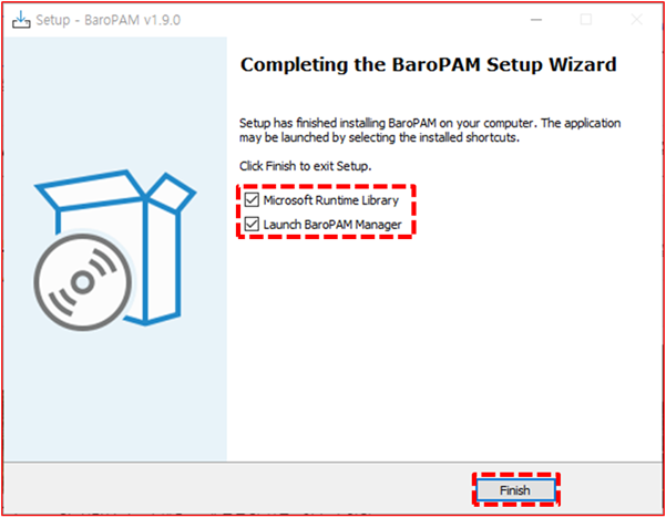 위 화면에서 Windows의 프로세스를 위한 패키지(vcredist)를 설치하기 위하여 "Microsoft Runtime Library" 및 BaroPAM의 환경설정을 위하여 "Launch BaroPAM Manager"를 선택한 다음 하단의 "Finish" 버튼을 클릭한다.