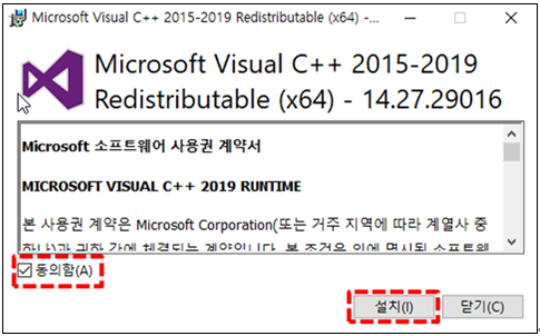 두번째, "Microsoft Visual C++ 2015-2019 Redistributable (x64) - …" 설치 화면에서 "MICROSOFT 소프트웨어 사용 조건"을 확인한 후 "동의함(A)"을 선택하고 "설치(I)" 버튼을 클릭하면 다음과 같이 "설치 진행률" 화면이 나타난다.