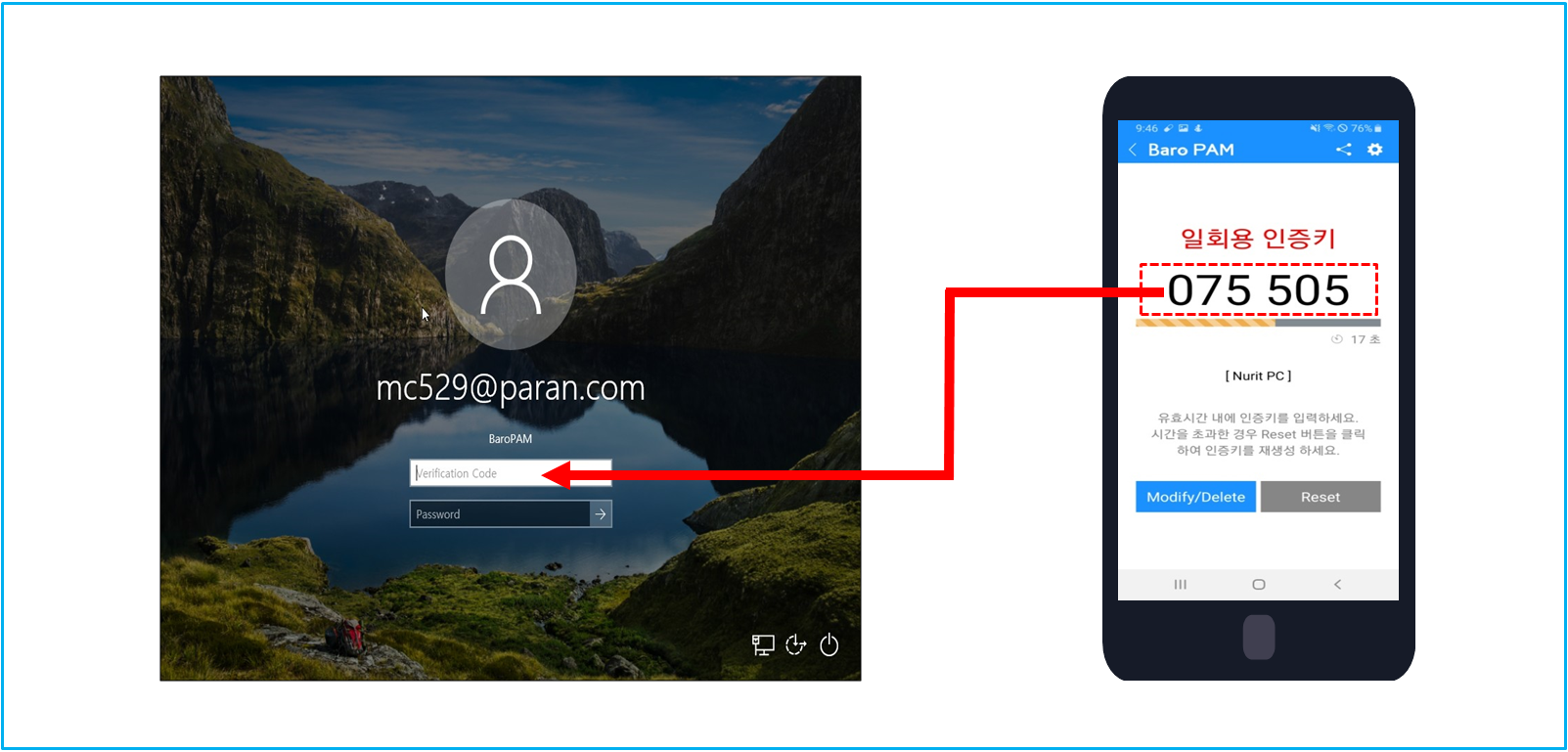 먼저 스마트폰에서 생성한 일회용 인증키를 Windows의 BaroPAM 로그온 화면에 입력하여 Windows의 인증을 받아야 로그온이 된다.