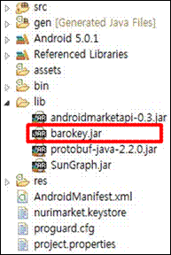 어플리케이션에 로그인 시 비밀번호란에 입력할 일회용 인증키를 생성하는 API는 "barokey.jar"로 제공되며, Eclipse나 Android studio를 사용하는 경우 libs 디렉토리에 "barokey.jar"를 위치시켜야 한다.