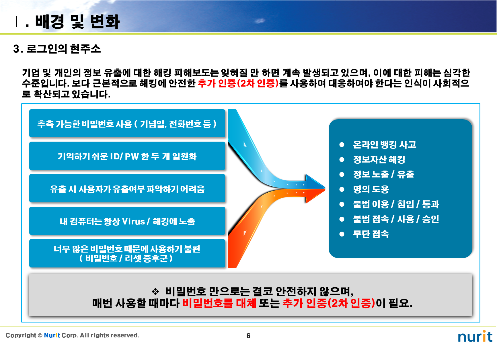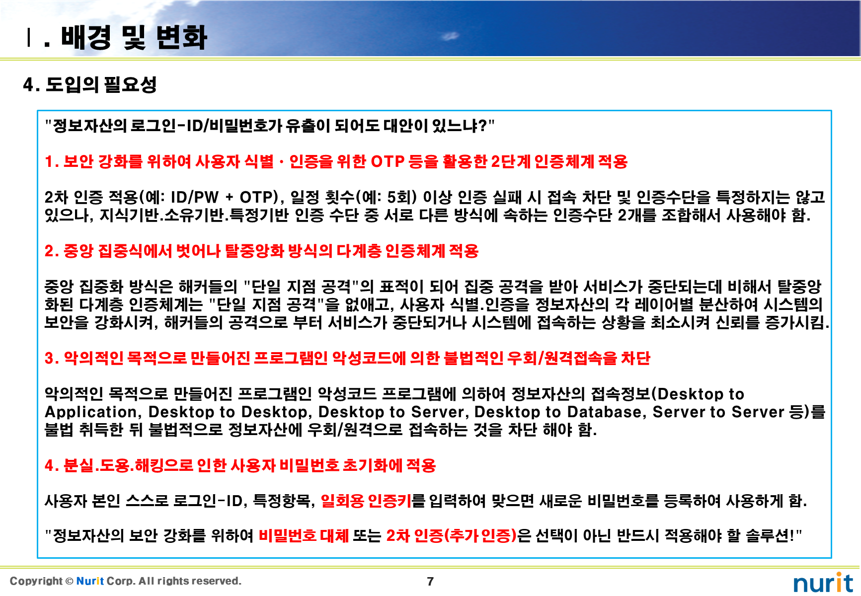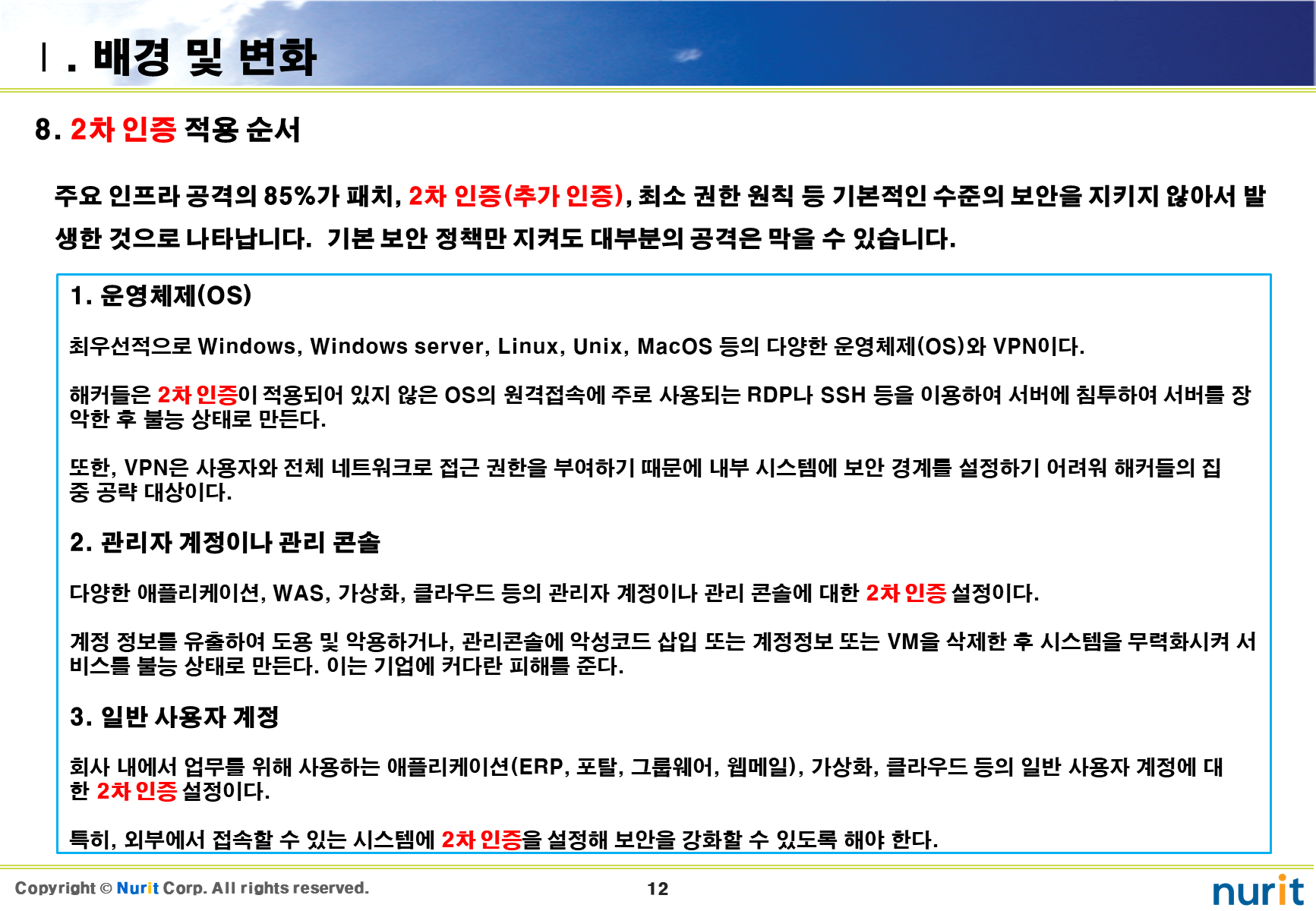 보안 솔루션 중 도입해야 할 1순위가 계정도용, 권한상승, 우회/원격접속, 중간자 공격을 차단할 수 있는 2차 인증 솔루션이다.
