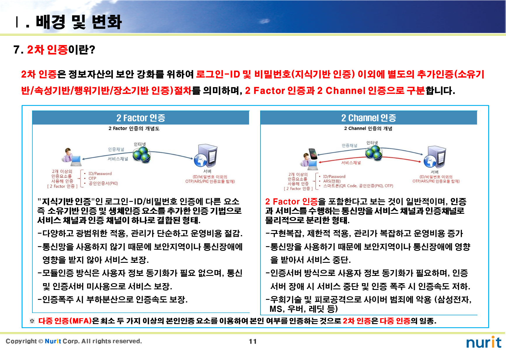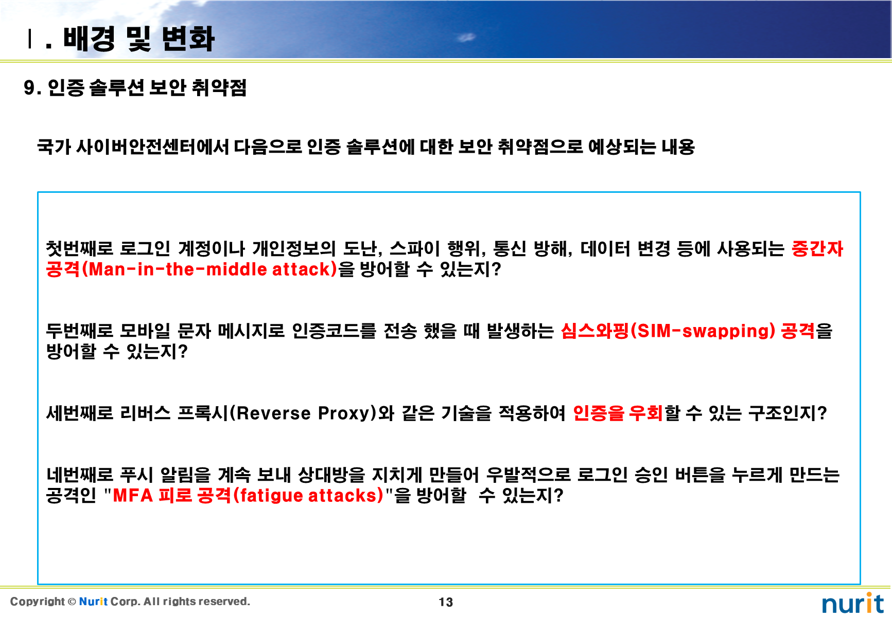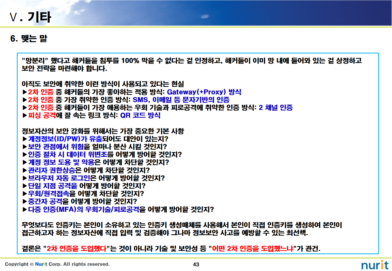 보안 솔루션 중 도입해야 할 1순위가 계정도용, 권한상승, 우회/원격접속, 중간자 공격을 차단할 수 있는 2차 인증 솔루션이다.