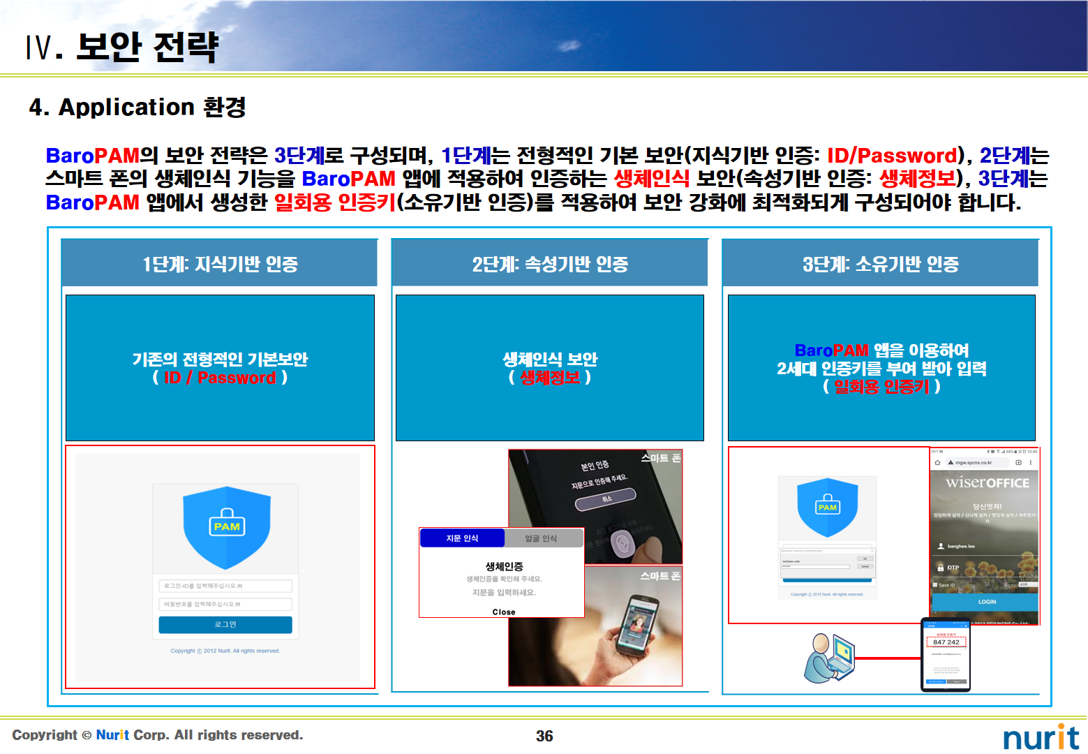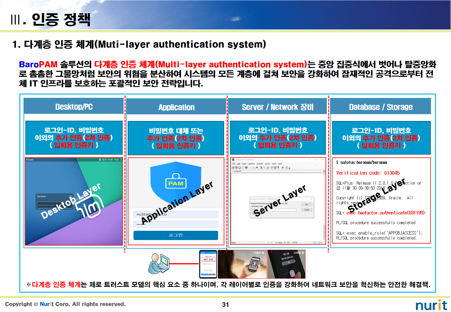 보안 강화하기 위하여 다계층 인증 체계(Multi-layer authentication system)를 지원하는 2차 인증을 적용하는 순서는 제일 첫번째로 운영체제(OS), 두번째로 관리자 계정이나 관리 콘솔, 세번째로 일반 사용자 계정이다.