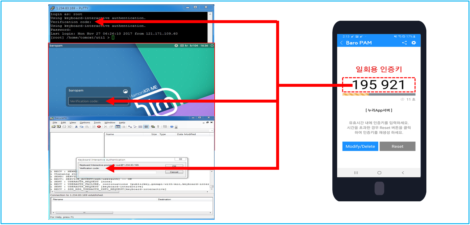 누구나 손쉽게 적용할 수 있는 플러그인 가능한 인증모듈 방식(PAM, Pluggable Authentication Module)의 2차 인증 방식으로 별도의 인증서버가 필요 없고, 통신하지 않고, 별도의 인증서버도 필요 없고, 누구나 휴대하고 있는 스마트폰을 인증키 생성 매체에서 본인이 생성한 일회용 인증키를 본인이 직접 입력하는 방식인 BaroPAM 솔루션은 사이버 범죄에 악용되지 않는다.