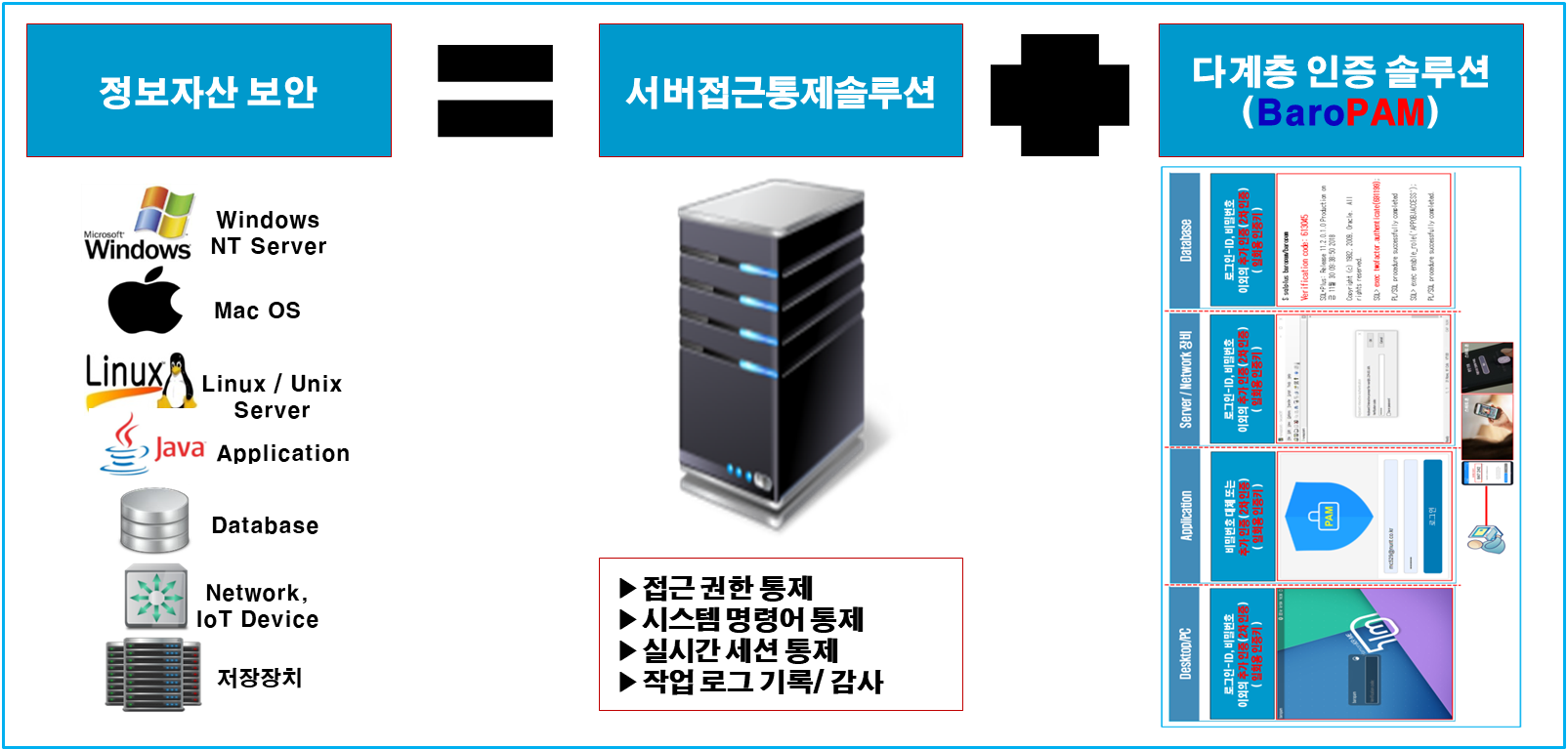 네트워크, 서버 IT 인프라 운영 시스템으로의 모든 접속과 작업을 통제·관리하고, 작업 내역에 대한 실시간 모니터링과 로그 기록 저장으로 사용자에 대한 철저한 통제와 감독하는 서버접근통제 솔루션과 정보자산의 다계층 인증 체계(Multi-layer authentication system)를 통한 계정도용, 권한상승, 불법적인 우회/원격 접속, 중간자 공격 등을 차단하는 BaroPAM 솔루션이 결합하여 정보자산의 보안을 강화하는 시너지 효과를 낼 수 있다.