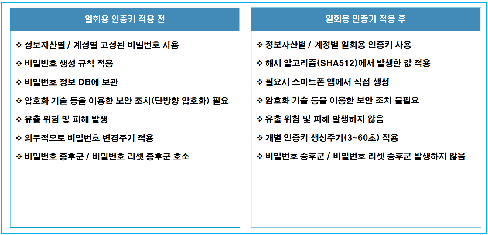 Application 통합인증 시 비밀번호를 BaroPAM의 일회용 인증키로 대체하여 비밀번호에 단방향 암호화가 불필요하며, 로그인-ID, 비밀번호가 유출되어도 안전하게 Application 통합인증을 할 수 있다.
