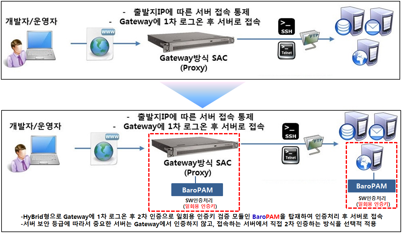 SAC 솔루션과 BaroPAM의 융합은 HyBrid형으로 Gateway에 1차 로그온 후 2차 인증(추가 인증)으로 일회용 인증키 검증 모듈인 BaroPAM을 임베디드하여 인증처리 후 서버로 접속하는 방식과 서버 보안 등급에 따라서 중요한 서버는 Gateway에서 인증하지 않고, 접속하는 서버에서 직접 2차 인증하는 방식으로 선택적으로 적용한다.