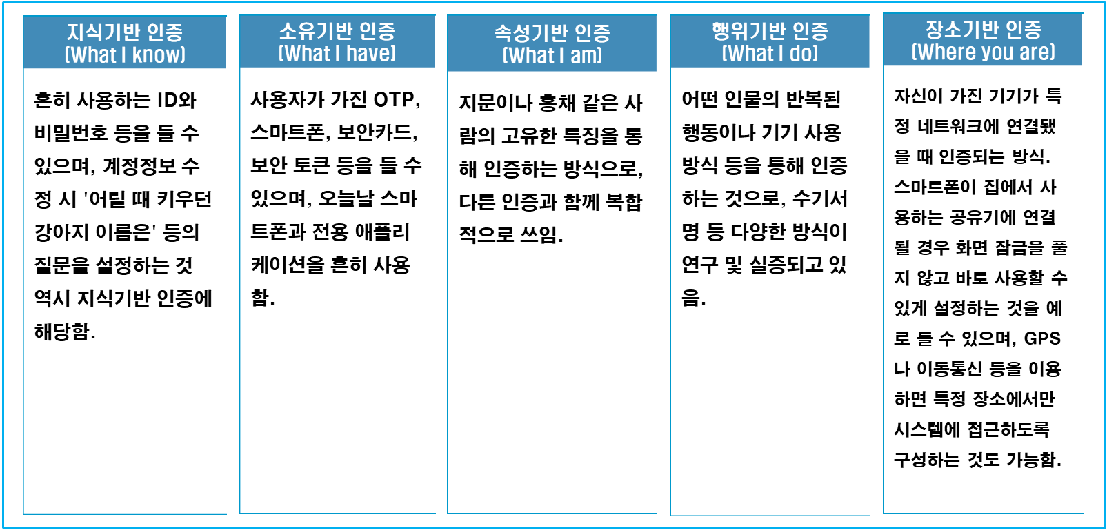 본인인증은 크게 지식기반 인증(What I know), 소유기반 인증(What I have), 속성기반 인증(What I am), 행위기반 인증(What I do), 장소기반 인증(Where you are) 등 5가지 요소로 구분할 수 있다.