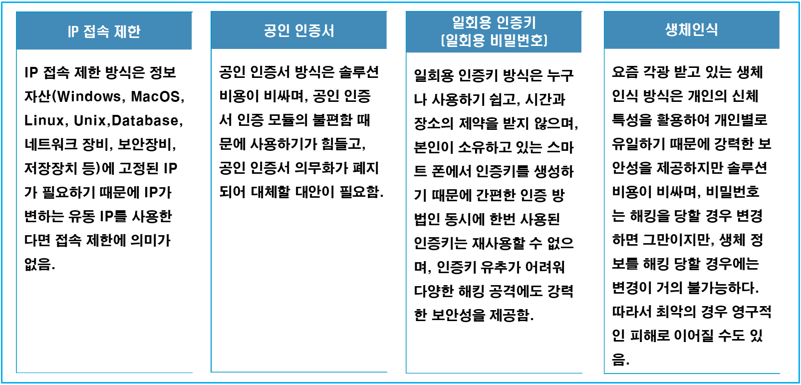 본인인증은 크게 IP 접속제한, 공인인증서, 일회용 인증키, 생체인식 방식 등 4가지 방식으로 구분할 수 있다.