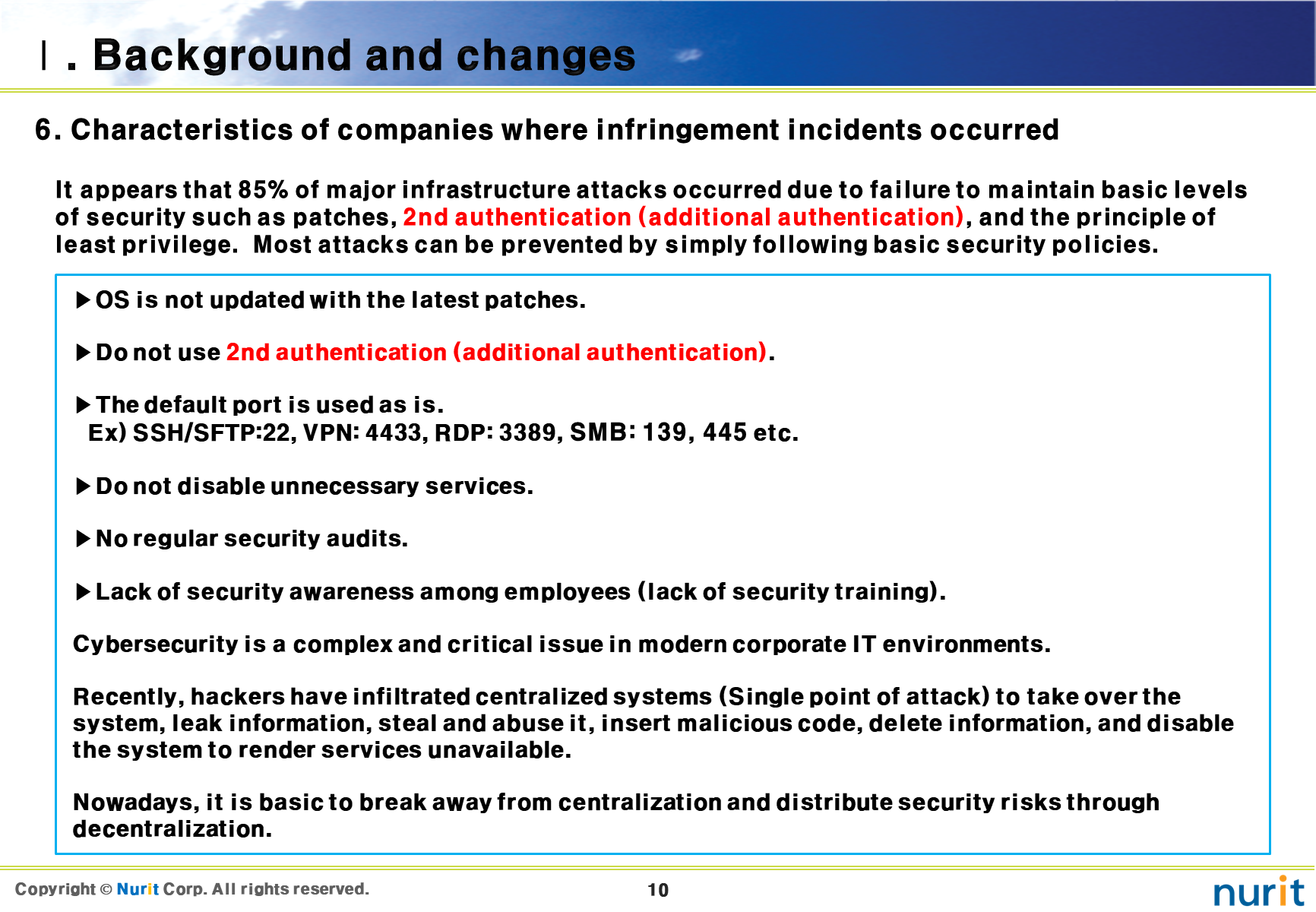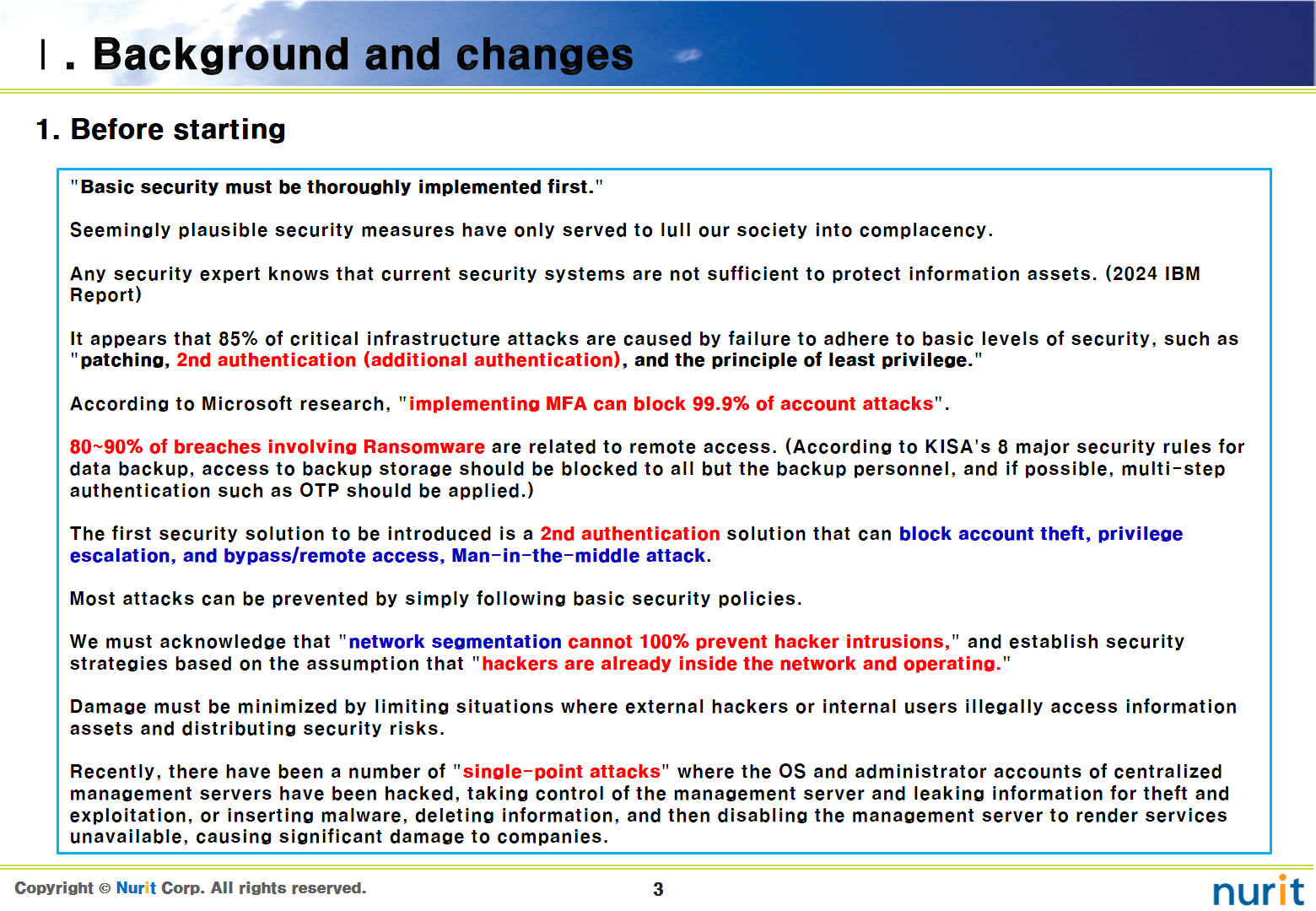 It appears that 85% of major infrastructure attacks occurred due to failure to maintain basic levels of security such as patches, 2nd authentication (additional authentication), and the principle of least privilege. (2024 IBM Report)