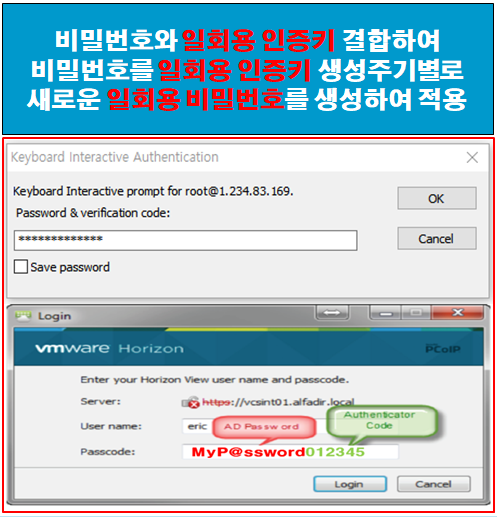만약, 2-factor 인증 솔루션이 적용되어 있다면 암호 입력란에 고정된 암호만 입력하는 경우 서버 로그인을 할 수 없게 된다.