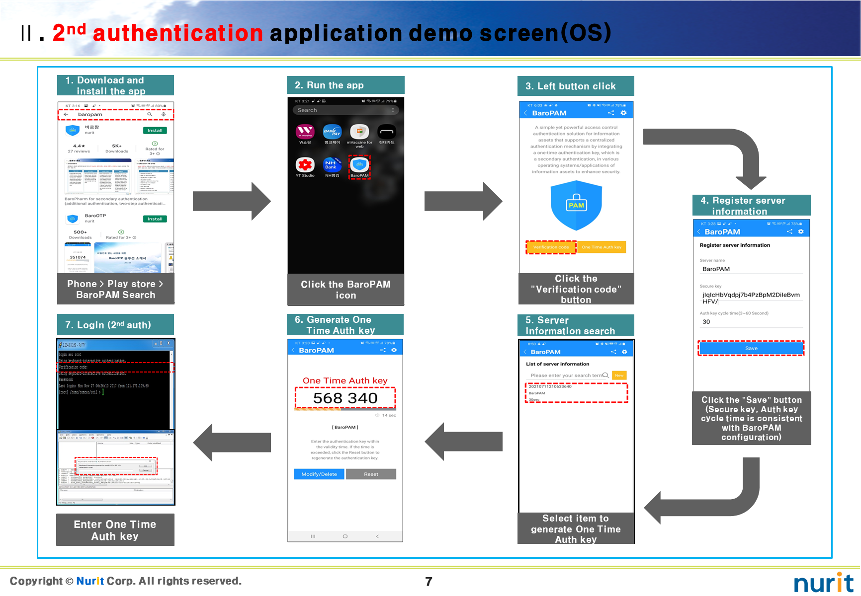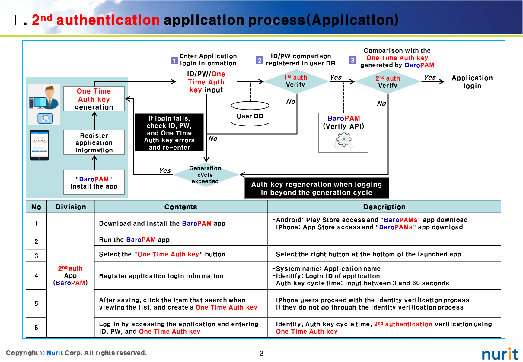 BaroPAM solution is a simple solution that supports a centralized authentication mechanism by grafting a one-time authentication key as additional authentication (2nd authentication) in various operating systems such as Windows, Linux, and Unix of information assets and applications such as ERP, groupware, electronic payment, and portal. It is an access control authentication solution to reinforce the security of powerful information assets.