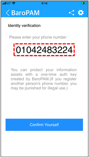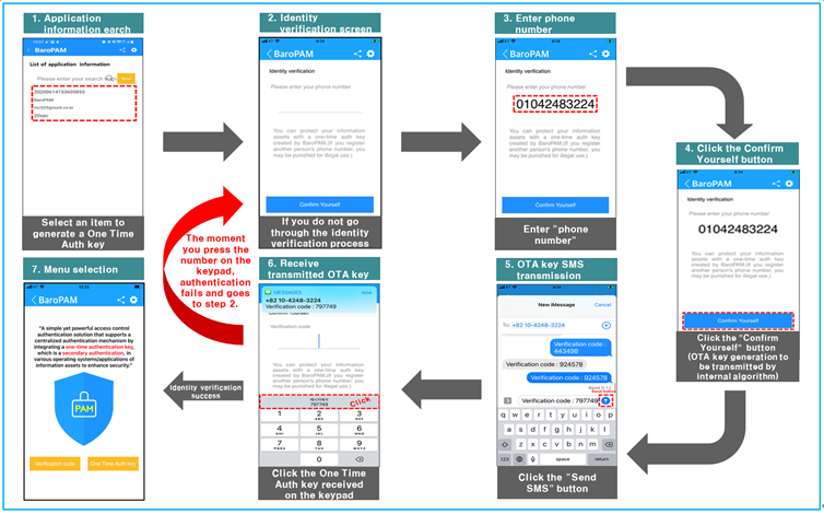 In addition, in order to prevent unauthorized use of other people's phone numbers, it is necessary to apply a separate identity verification function. In the "BaroPAM" app, its own algorithm is applied and the identity verification procedure is executed as follows.