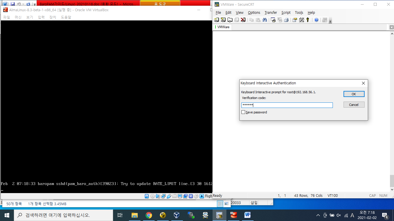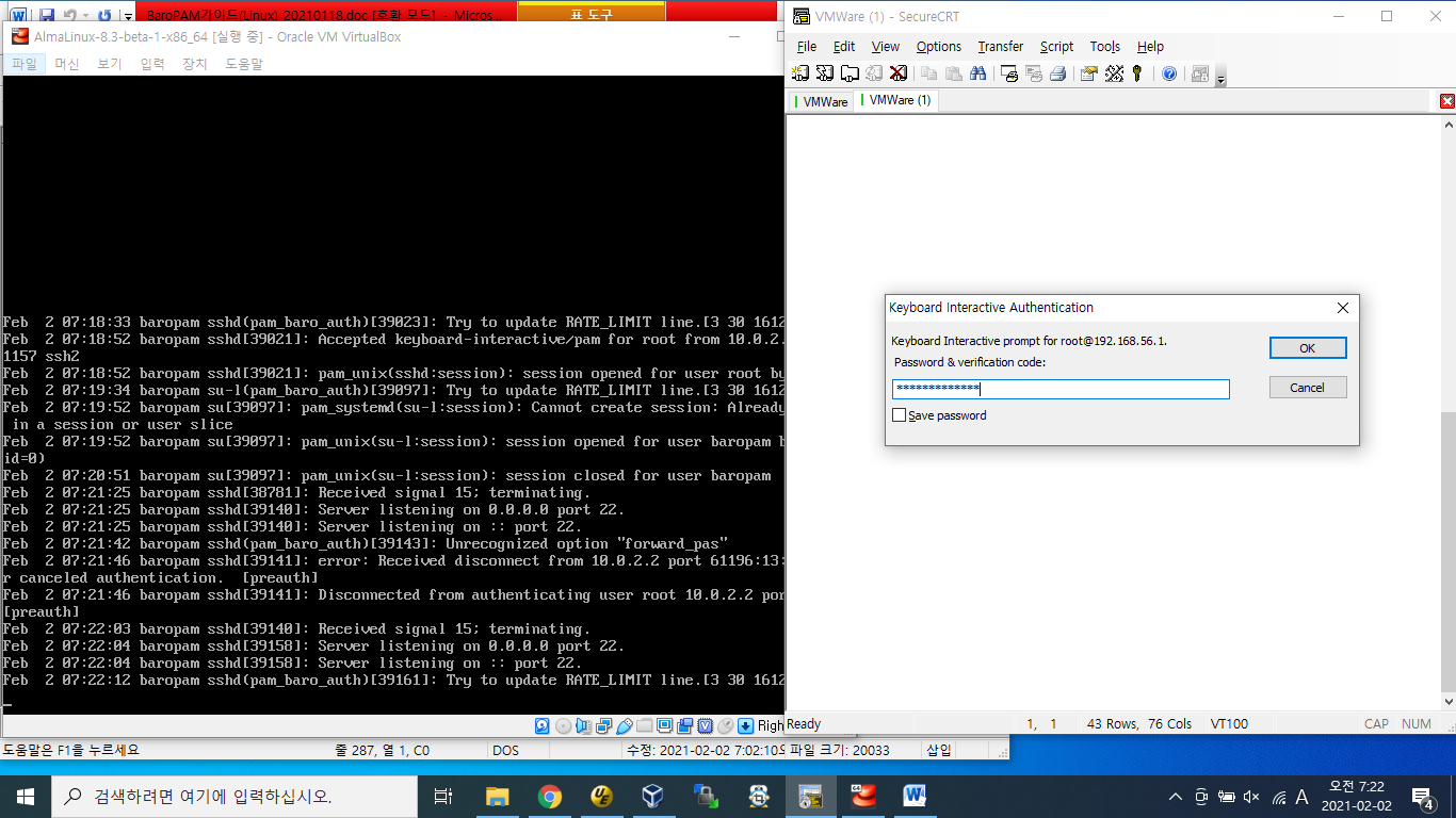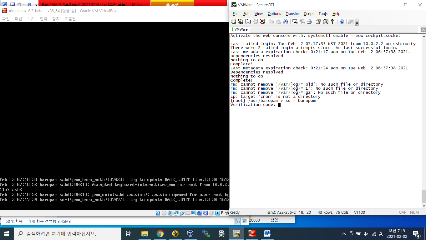 AlmaLinux Beta 버젼의 ISO 파일(https://almalinux.org)을 다운로드 받아서 설치 후 AlmaLinux의 보안 강화를 위하여 인증이 필요한 다양한 운영체제와 애플리케이션에 누구나 손쉽게 바로 적용할 수 있는 플러그인 가능한 인증 모듈(PAM, Pluggable Authentication Module) 방식을 기반으로 하는 솔루션인 BaroPAM을 설치하여 테스트한 결과 CentOS를 AlmaLinux로 대체해도 될 것 같다.