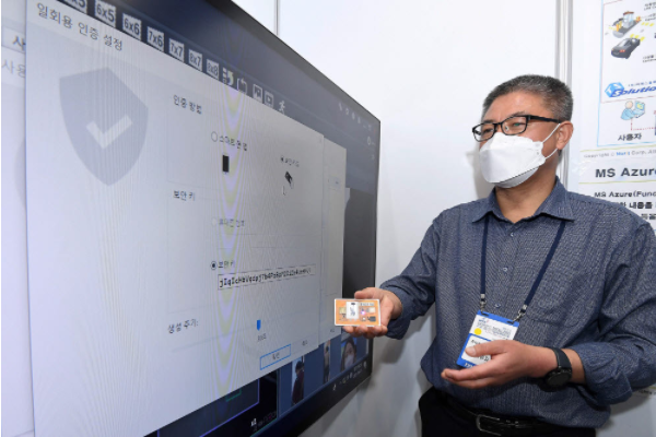 국내 최대 정보통신기술(ICT) 전시회 '월드IT쇼(WIS) 2021'가 21일 부터 사흘간 서울 강남구 코엑스에서 열린다. WIS 2021 누리아이티 부스에서 직원이 생체정보를 플라스틱 카드에 적용한 본인인증 솔루션을 선보이고 있다.