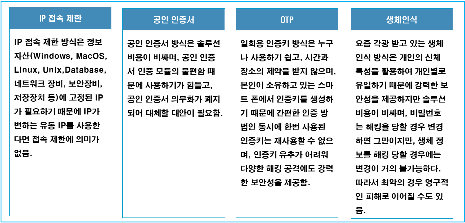 IP 접속 제한 방식은 정보자산에 고정IP가 필요하기 때문에 유동IP를 사용한다며 접속 제한에 의미가 없으며, 공인인증서 방식은 솔루션 비용이 비싸며 공인인증서 인증 모듈의 불편함 때문에 사용하기가 힘들고, 공인인증서 의무화가 폐지되어 대체할 대안이 필요하며, 생체인식 방식은 솔루션 비용이 비싸며, 생체정보가 유출되는 순간 평생 사용할 수가 없다.