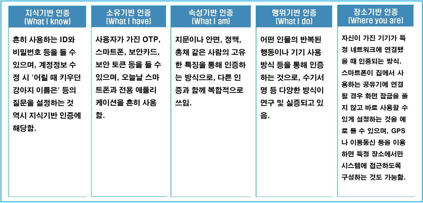 다중 인증(MFA, Multi-Factor Authentication)는 최소 두 가지 이상의 인증 요소를 이용하여 본인 여부를 인증하는 것으로 비밀번호와 같이 해당 이용자만이 알고 있는 요소(지식기반), 하드웨어 토큰과 같이 해당 이용자만이 갖고 있는 요소(소유기반), 생체인식 정보와 같이 해당 이용자만의 고유 요소(속성기반), 어떤 인물의 반복된 행동이나 기기 사용 방식(행위기반), GPS나 이동통신과 같이 특정 장소(장소기반) 등에서 최소 2개 이상을 함께 사용하여 이용자를 인증한다.