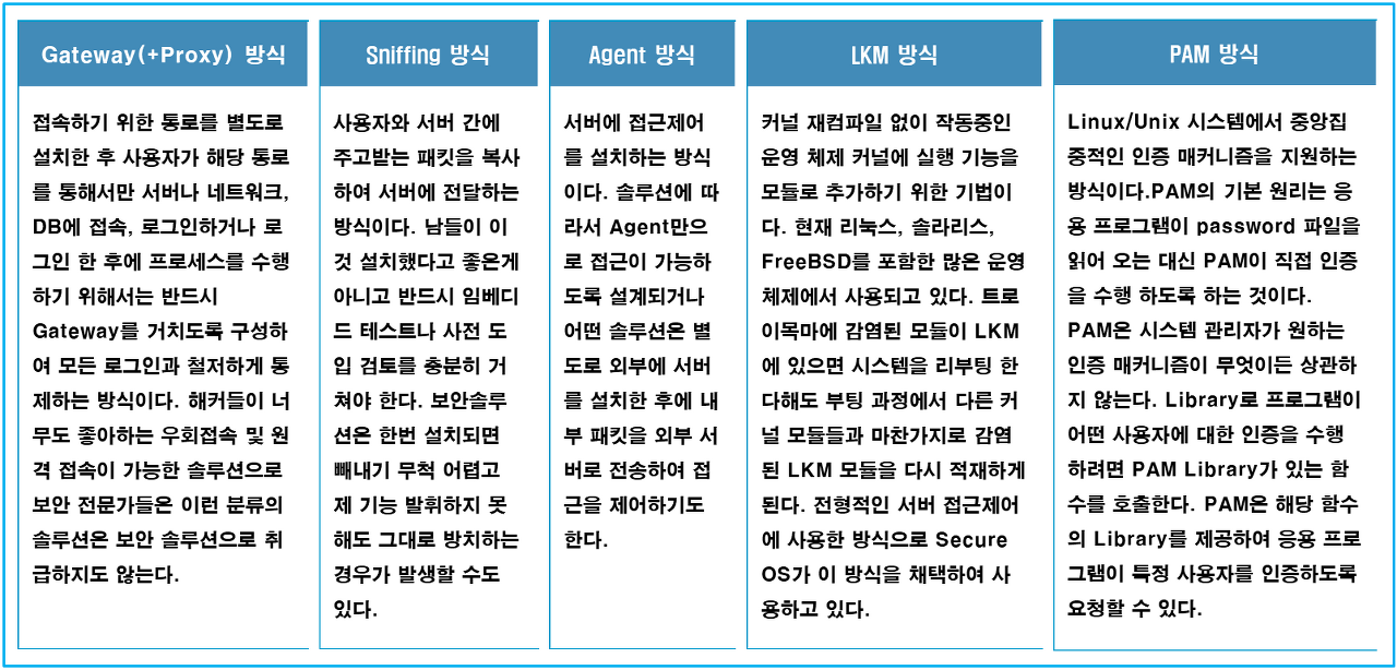 보안 솔루션의 적용 방식은 크게 Gateway(+Proxy), Sniffing, Agent, LKM(Loadable Kernel Module), PAM(Pluggable Authentication Module) 방식 등이 있다.