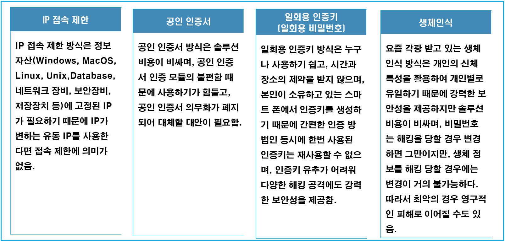 정보자산의 보안 강화를 위하여 어느 한 구간만 보안 강화는 별로 도움이 되지 않으며, 이제는 모든 정보자산에 대한 다중 인증 솔루션의 적용은 선택이 아닌 필수로 보다 더 안전하게 정보자산을 보호할 수 있다.