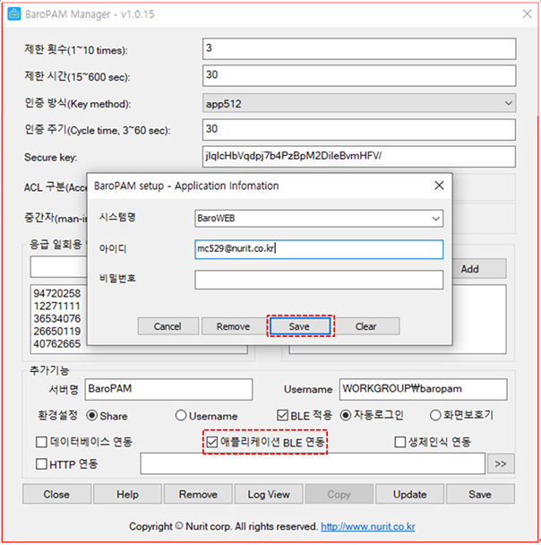 사용자의 불편을 최소화하기 위하여 BaroPAM의 앱과 연동하여 한번의 터치로 컴퓨터의 자동 로그인과 화면 보호기의 잠금방지/자동잠금/자동해제하는 기능을 사용할 경우 "BLE 적용"를 선택한다.