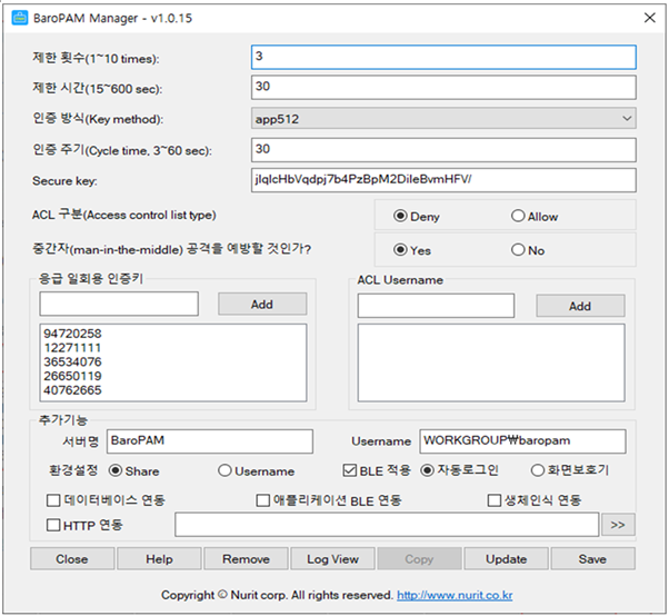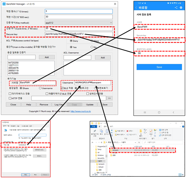 만약, BLE(Bluetooth Low Energy)를 사용하는 경우에는 설정한 서버명과 일회용 인증키 생성기인 BaroPAM 앱에 등록된 서버명이 서로 다른 경우 Windows의 자동 로그온과 화면 보호기의 잠금방지/자동잠금/자동해제하는 기능이 정상적으로 작동되지 않는다.