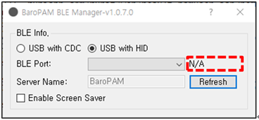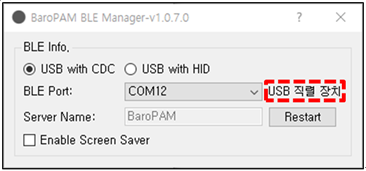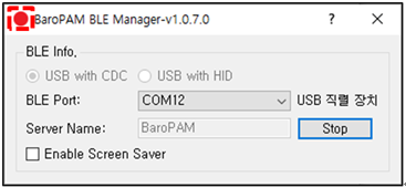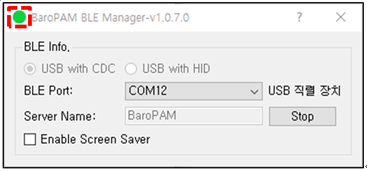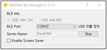 참고) Bluetooth Adapter가 내장되어 경우는 그대로 사용하면 되지만 내장되어 있지 않은 경우는 USB 직력 장치인 "Bluetooth USB Dongle"를 컴퓨터에 꽂으면 자동으로 "BLE Port"에 설정되며, "Server name"은 BaroPAM의 환경 설정 시 "서버명"에 등록된 정보를 표시한다.