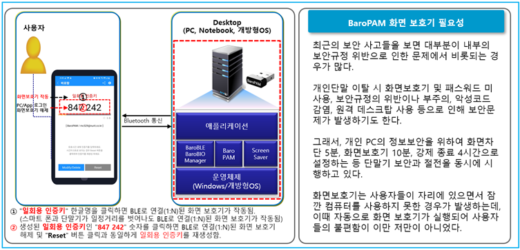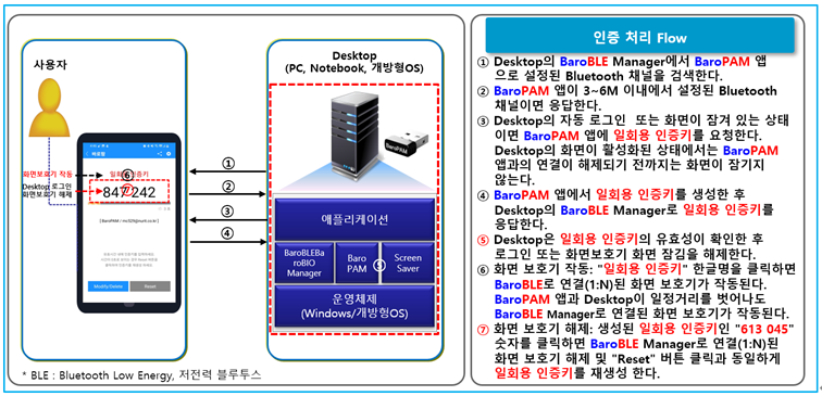이렇게 함으로써 Desktop과 BaroPAM 앱과 통신연결 시 일회성 인증체계를 통해 서비스에 대한 보안인증을 제공한다. 일반적으로 블루투스(BLE) 등의 초기 연결 시, 보안에 취약한 고정형 비밀번호로 연결하지 않고 BaroPAM의 일회용 인증키를 활용해 통신의 유효성을 검증해 보안을 강화한다.