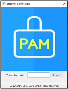 BaroPAM 앱에서 생성한 일회용 인증키를 "Verification code:"에 입력한다. 만약, 입력한 일회용 인증키가 틀린 경우 다음과 같이 하단의 메시지란에 "Certification failed. Please re-enter your verification code." 표시되며, BaroPAM 앱에서 일회용 인증키를 재생성하여 입력해야 한다.