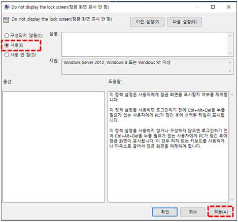 여섯번째, Windows의 잠금화면을 없애기 위하여 위 화면에서 "사용(E)" -> "적용(A)"을 선택하여 클릭하면 다음과 같이 상태가 "구성되지 않음"에서 "사용"으로 변경된 것을 확인할 수 있다.