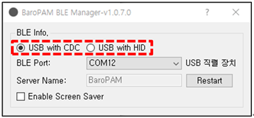 BaroBLE에서는 단말기의 환경에 따라 USB Function Driver로 HID(Human Interface Device, 마우스, 키보드 같은 저속 시리얼을 위한 클래스)와 CDC(Communication Device Class, 시리얼 통신에 주로 사용)를 구분한다.