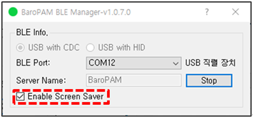 5) 컴퓨터와 BaroPAM 앱이 Bluetooth 통신으로 연결된 상태이지만 BaroPAM 앱을 놓고 잠시 자리를 비워야 하는 경우에 "Enable Screen Saver"를 선택하면 화면 보호기의 잠금 방지 기능이 해제된다.