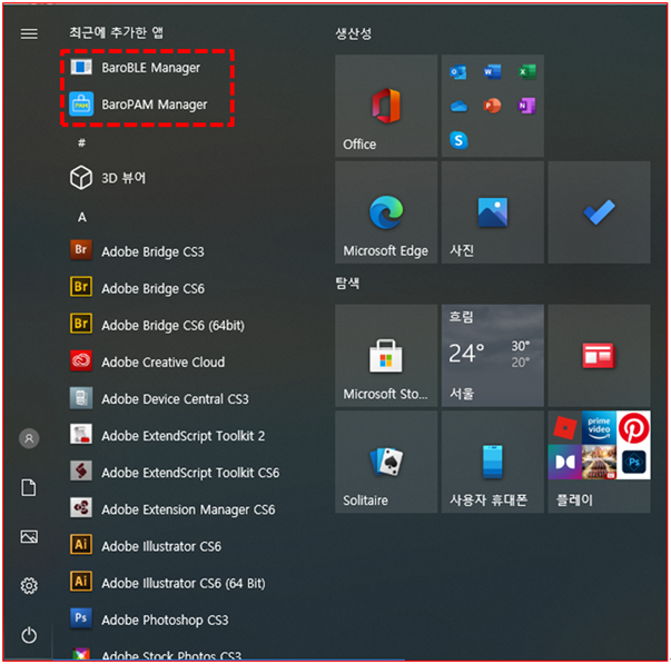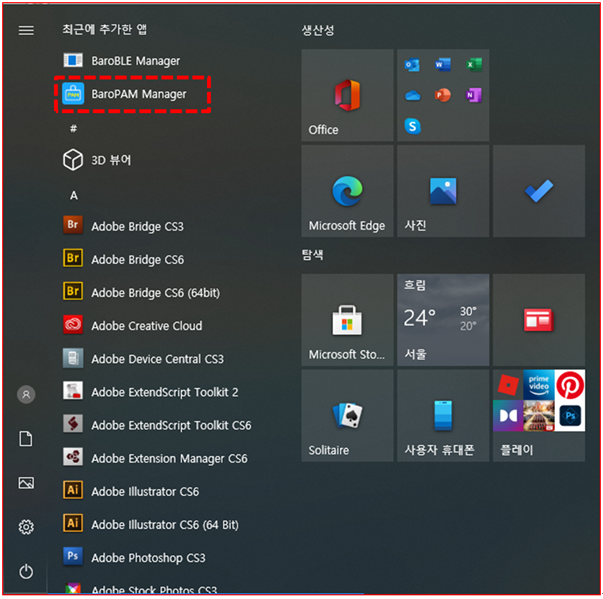 첫번째, 정상적으로 BaroPAM의 설치가 완료되면, Windows의 하단 오른쪽에 있는 "시작" 버튼을 클릭하면 "최근에 추가한 앱"에 "BaroBLE Manager와 BaroPAM Manager"가 나타난다.
