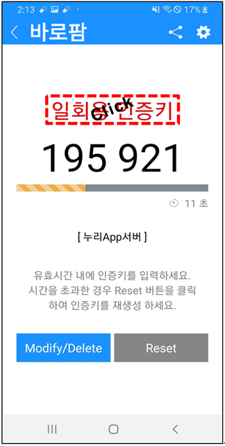 만약, 이미 BaroPAM 앱과 데스크탑에 기동된 BLE Manager가 Bluetooth 통신으로 연결(1:N)되어 데스크탑의 화면 보호기가 작동하고 있는 경우는 BaroPAM 앱에 생성된 일회용 인증키인 "195 921" 숫자를 클릭하면 BLE Manager와 연결(1:N)되어 있는 데스크탑의 화면 보호기 기능을 해제하며, "Reset" 버튼 클릭과 동일하게 일회용 인증키를 재생성 한다.