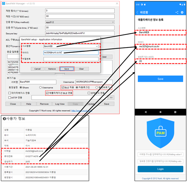 네번째, "BaroPAM Setup" 화면에서 입력한 "인증주기, Secure key, 서버명"을 "BaroPAM" 앱의 "서버 정보 등록" 화면에서 동일하게 입력해야 한다.