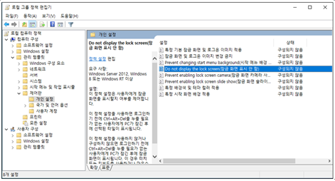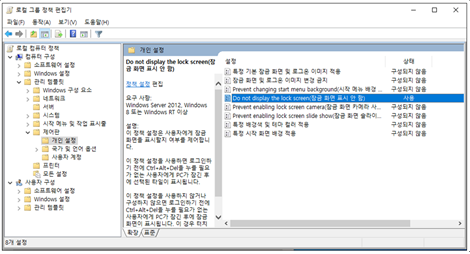 다섯번째, Windows의 잠금화면을 없애기 위하여 위 화면에서 "로컬 컴퓨터 정책" -> "컴퓨터 구성" -> "관리 템플릿" -> "제어판" -> "개인 설정" -> "Do not deplay the lock screen(잠금 화면 표시 안함)"을 선택하여 클릭하면 다음과 같은 화면이 나타난다.