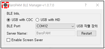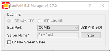 1) 화면 상단 오른쪽의 오랜지색 표시는 "BaroBLE Manager"가 기동된 상태로 컴퓨터와 BaroPAM 앱이 연결되지 않는 연결 대기상태로 "Stop" 버튼을 클릭하면 재기동할 수 "Restart" 버튼으로 변경된다.