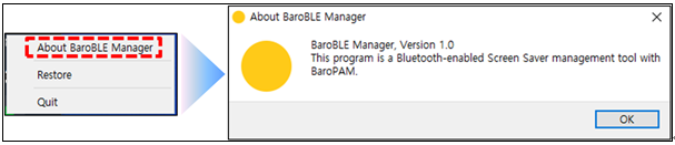 ①"BaroBLE Manager"의 메뉴 화면에서 "About BaroBLE Manager"을 클릭하면 "BaroBLE Manager"에 대한 정보를 표시한 하면이 나타난다.