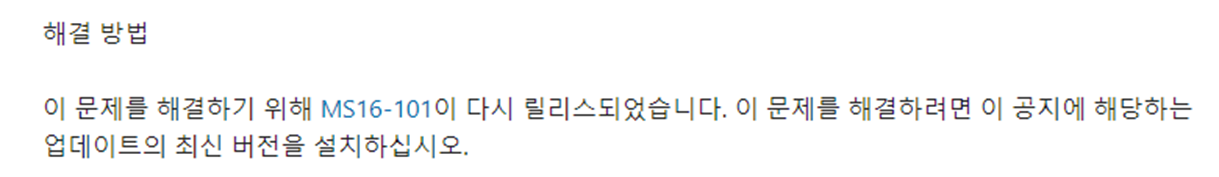 이 문제를 해결하기 위해 "MS16-101"이 다시 릴리즈 되었다. 이 문제를 해결하려면 이 공지에 해당하는 업데이트의 최신 버젼을 설치하라.