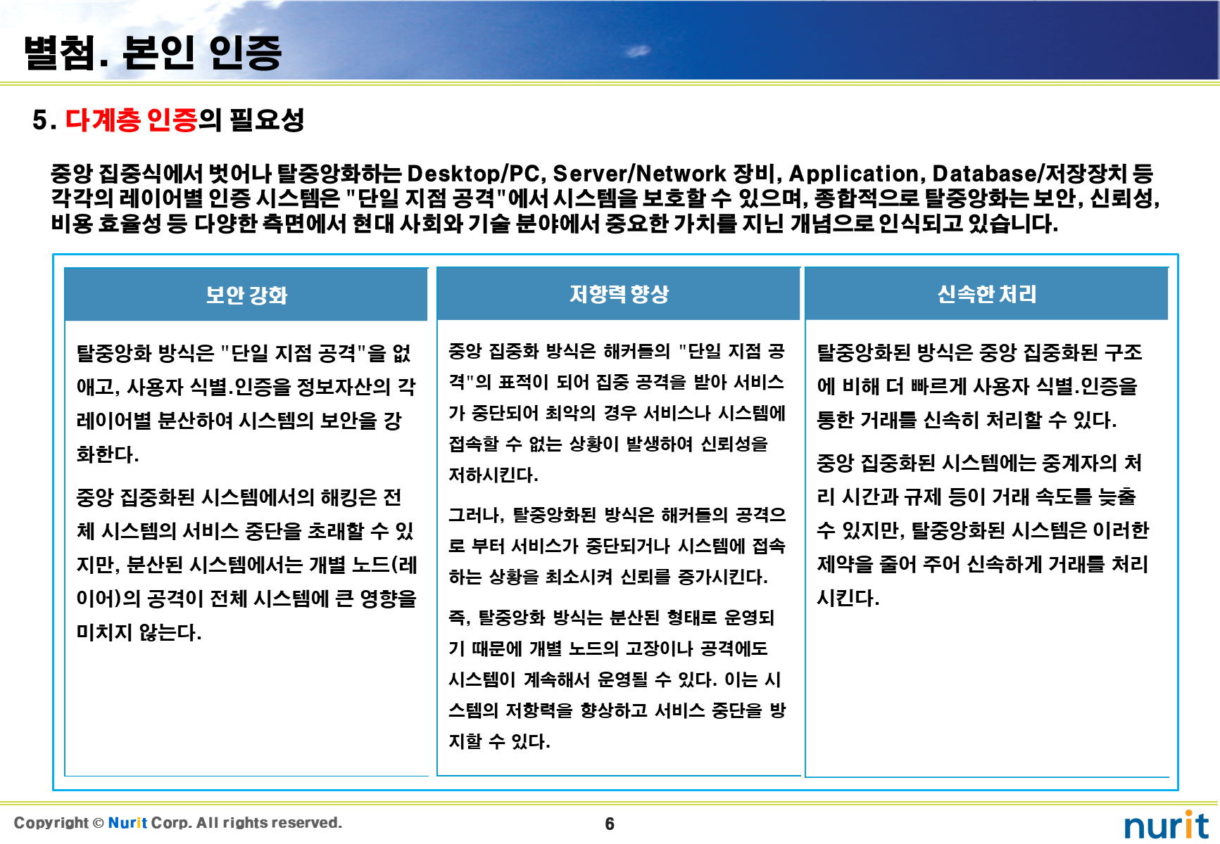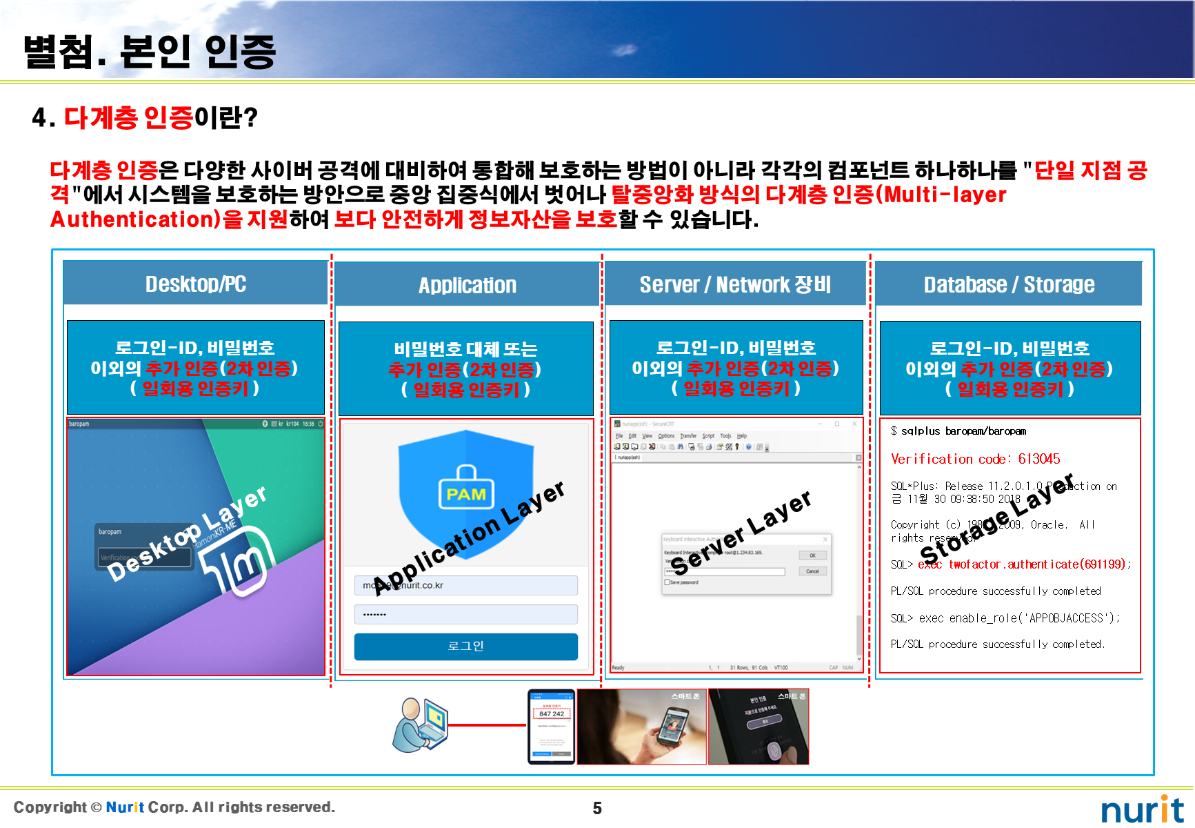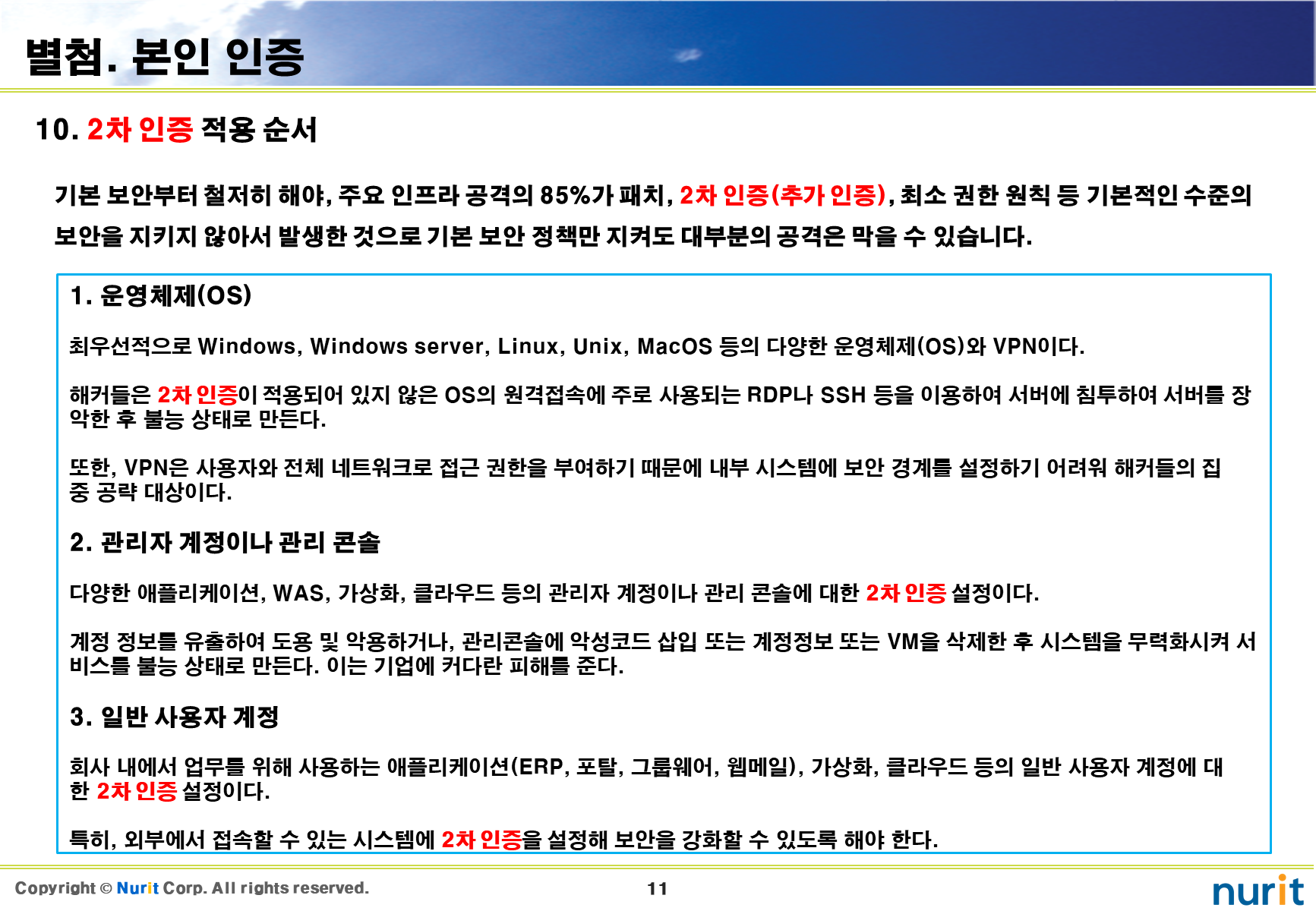 보안 강화하기 위하여 다계층 인증 체계(Multi-layer authentication system)를 지원하는 2차 인증을 적용하는 순서는 제일 첫번째로 운영체제(OS), 두번째로 관리자 계정이나 관리 콘솔, 세번째로 일반 사용자 계정이다.