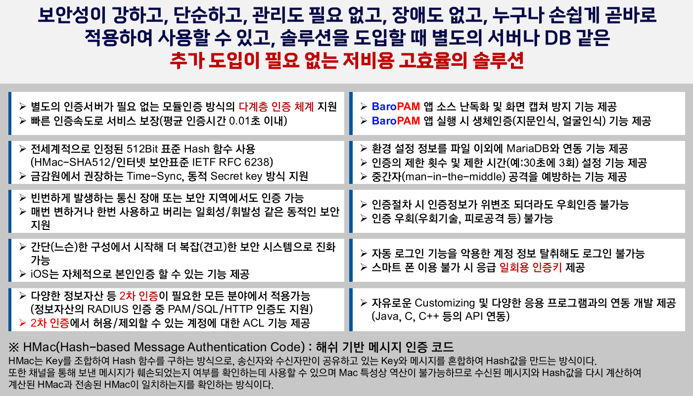 BaroPAM 솔루션은 별도의 인증서버가 필요 없는 모듈인증 방식으로 중앙 집중식에서 벗어나 탈중앙화 방식의 다계층 인증 체계(Multi-layer authentication system)를 지원하며, 보안성이 강하고, 단순하고, 관리도 필요 없고, 장애도 없고, 누구나 손쉽게 곧바로 적용하여 사용할 수 있고, 솔루션을 도입할 때 별도의 서버나 DB 같은 추가 도입이 필요 없는 저비용 고효율의 솔루션이다.