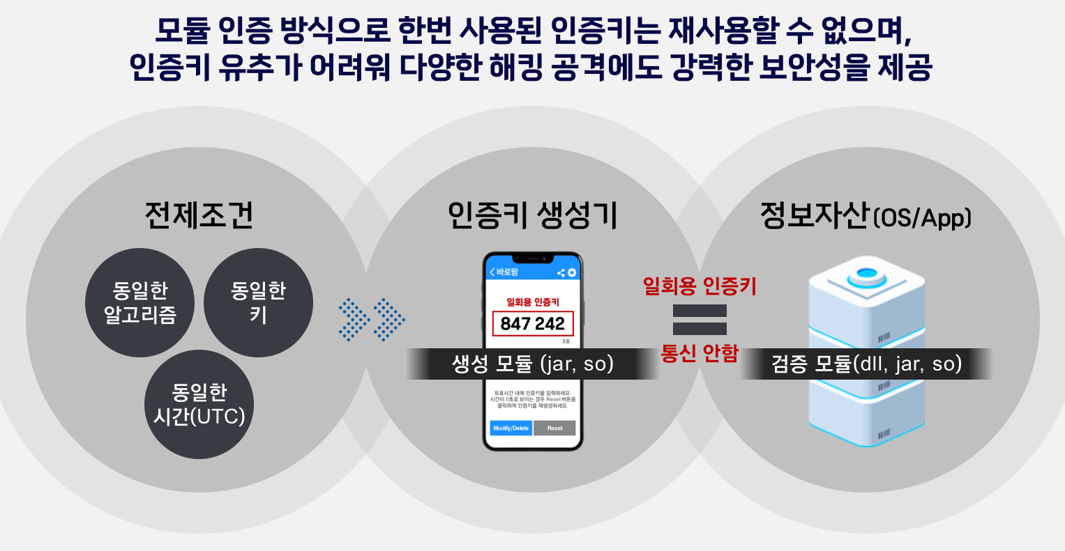 BaroPAM 솔루션의 일회용 인증키(OTA, One-Time Authentication)는 제로 트러스트 보안 모델로 별도의 인증서버가 필요 없는 모듈 인증 방식으로 단방향 암호 기반의 해시 알고리즘에 따라 매 생성주기마다 변경되는 추정 할 수 없는 인증 키를 생성하여 이용하는 보안 시스템으로 아이디어 자체는 100년도 넘은, 그리고 그만큼 검증된 기술이다.