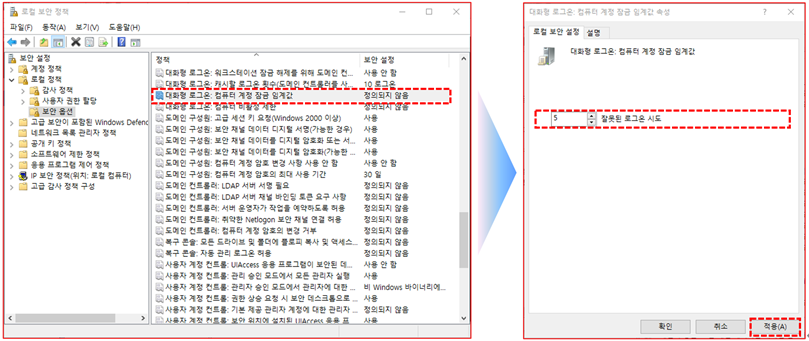 이 정책의 설정은 호출된 보안 정책 화면에서 "보안 설정 -> 로컬 정책 -> 보안 옵션 -> 대화형 로그온: 컴퓨터 계정 잠금 임계값"을 선택한 후 잘못된 로그온 시도 횟수인 "5"회를 입력한 후 "적용(A)" 버튼을 눌러서 설정값을 적용한다.