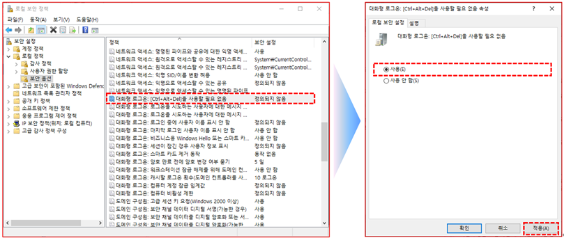 두번째, 호출된 보안 정책 화면에서 "보안 설정 -> 로컬 정책 -> 보안 옵션 -> 대화형 로그온: [Ctrl + Alt + Del]을 사용할 필요 없음"을 선택한 후 "사용(E) -> 적용(A)"을 적용한다.
