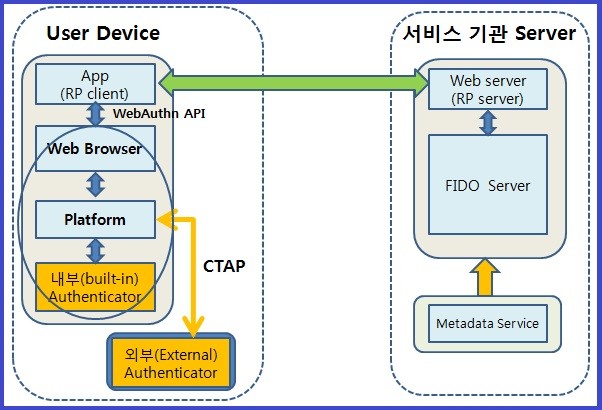 아래 그림은 FIDO 2.0의 내부 동작 구조를 보여 줍니다.